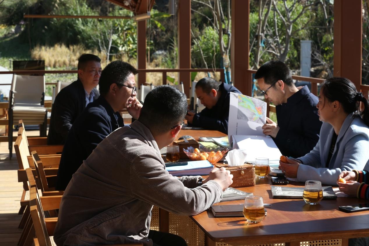 在涧茶台,万书记详细翻阅了海花沟总体规划设计相关资料,并关切地询问项目目前土地的落实情况,李总就书记关心的方面作了细致汇报和说明。
